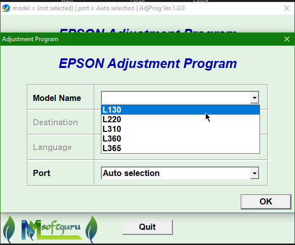 3) Open Adjprog.exe, you can right-click and select Open, Click the “Select” button and choose L130 then click Ok, and after that click the Particular adjustment mode button.